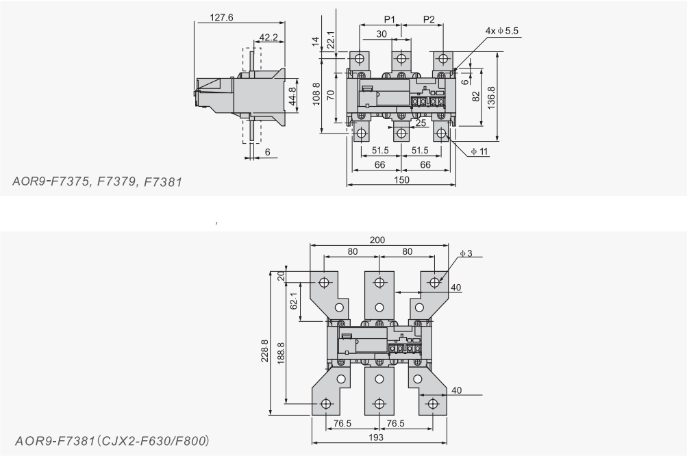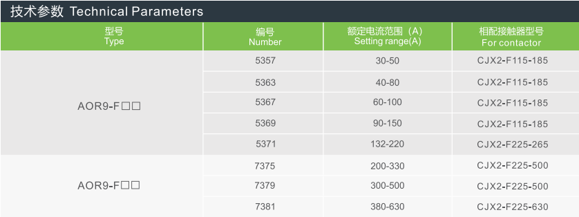 AOR9-F系列热过载继电器适用于交流50H或60Hz,电压至660V,电流至630A及以下电路,供交流电动机热保作用。并且有差动机构和温度补偿环节,可与CJX2-F大容量接触器组装,也可独立安装。