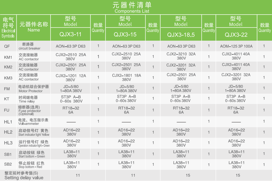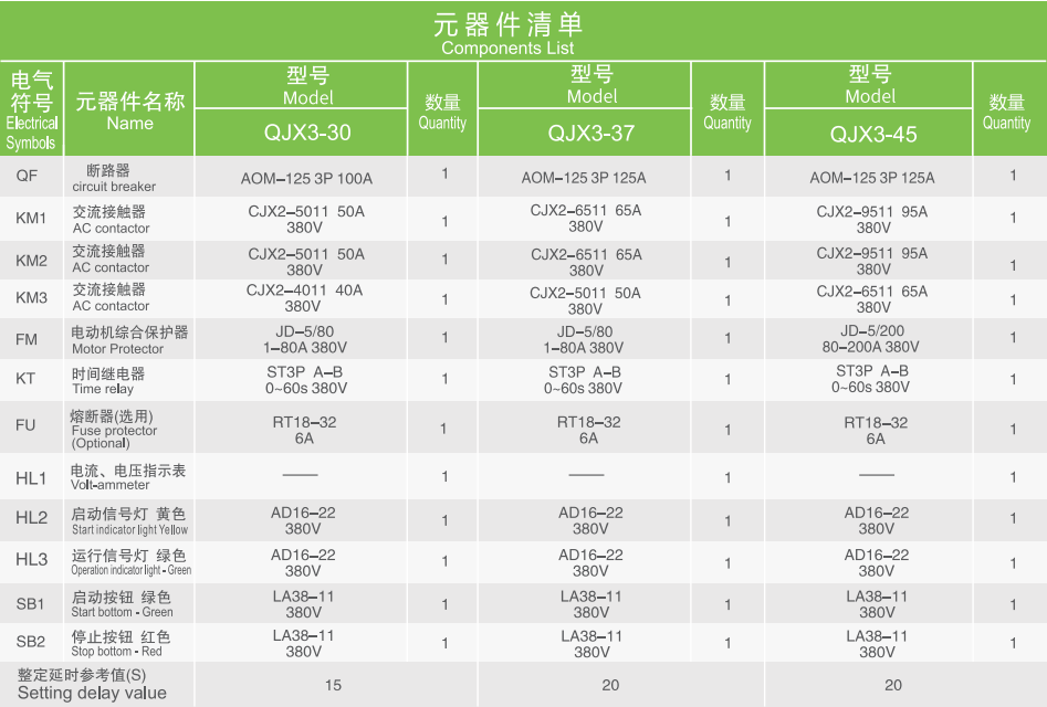 QJX3 系列星三角起动器,使用于交流440V50/60Hz,在AC-3使用功率为11KW~45KW以下的三相鼠笼型感应电动机降压起动之用,启动方式有“Y”自动换成“△”运行,对电动机具有过载,断相与短路保护功能,广泛用于压缩机,风机,水泵等工业设备。