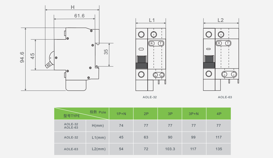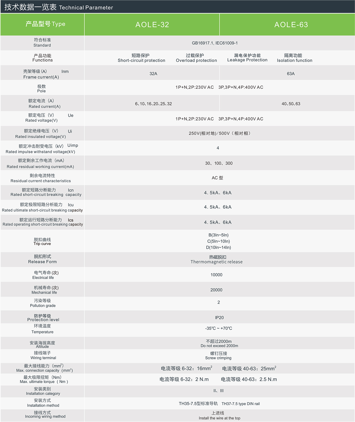 AOLE系列剩余电流动作断路器适用于交流50Hz/60Hz,额定电流至63A的线路中使用,当人身触电或电网泄漏电流超过规定值时,剩余电流动作断路器能在极短的时间内迅速切断故障电源,以保护人身及用电设备的安全,可作为线路的过载、短路保护以及在正常情况下也可以用在不频繁地通断电器装置和照明线路,此断路器适用于工业和商业的照明配电系统。