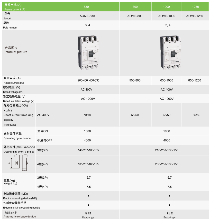 AOME系列电子式断路器适用于交流50Hz,额定工作电压至1000V,额定工作电流16A至1250A的低压电力系统。
